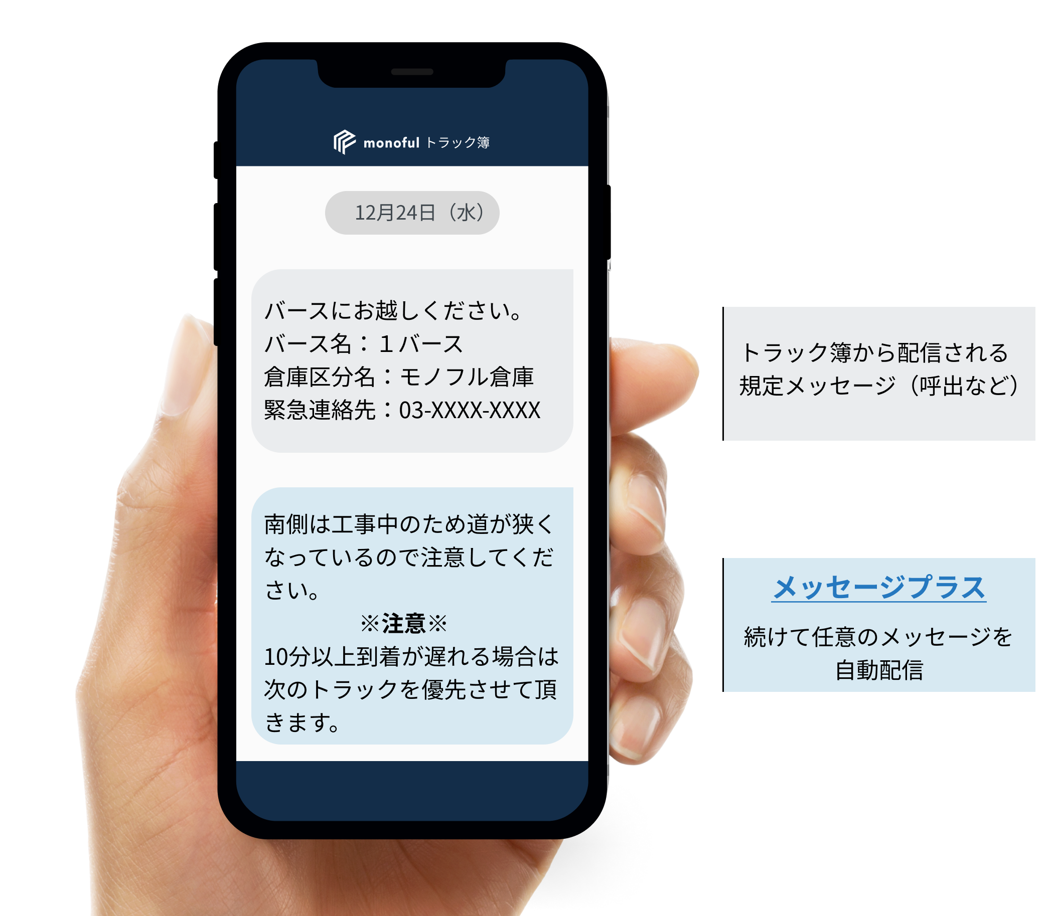 トラック簿から配信される規定のメッセージ(呼出・予約確定などの固定メッセージ)に続けて、任意のメッセージを自動配信することができます。