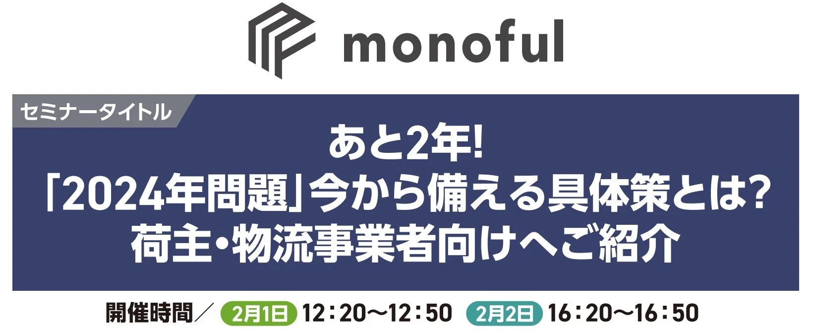 ロジスティクス・エコシステム*1を推進する株式会社モノフル(日本GLP株式会社のグループ企業、代表取締役社⻑:藤岡 洋介、以下「モノフル」)は、2月1日(火)2日(水)に東京ビッグサイトで開催されるロジスティクスソリューションフェア2022にて、セミナー登壇いたします。