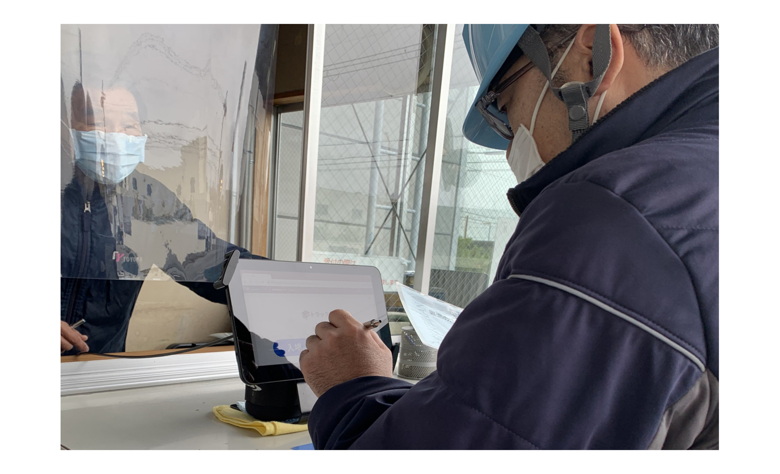 受付時に紙や口頭で案内しているアルコールチェックや構内ルールの案内に便利です。
